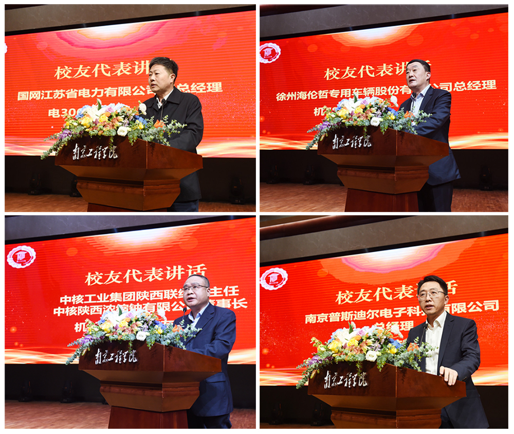 国网江苏省电力有限公司副总经理、电306班校友陈庆,徐州海伦哲专用车辆股份有限公司总经理、机7804班校友尹亚平,中核工业集团陕西联络部主任、中核陕西浓缩铀有限公司董事长、机8751班校友鄢斌,南京易充电动汽车服务有限公司/南京普斯迪尔电子科技有限公司总经理、材料001班校友李鑫作为校友代表发言,他们纷纷表示,作为南工程学子,他们在南工程收获了知识、收获了能力、收获了友谊,遇到了可亲可敬的老师。