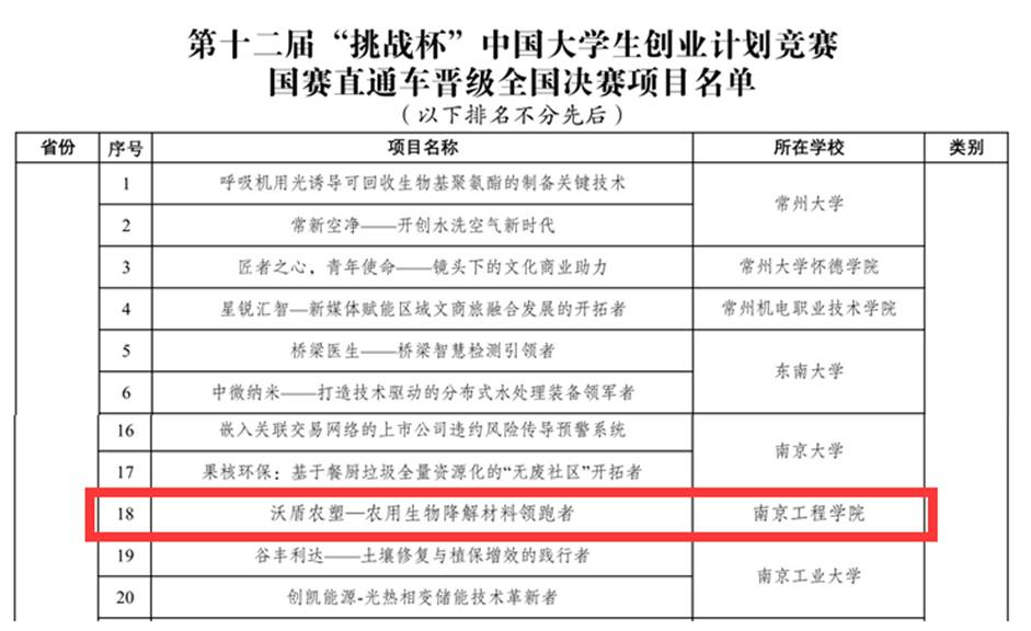 近日,第十二届“挑战杯”中国大学生创业计划竞赛(小挑)国赛直通车晋级全国决赛项目名单公布,太阳集团材料科学与工程学院选送的作品《沃盾农塑—农用生物降解材料领跑者》榜上有名。