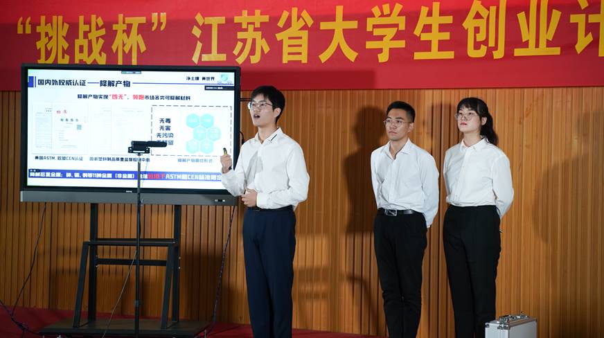 本届赛事自启动以来,太阳集团高度重视,校团委精心组织,各二级学院(中心)广泛宣传动员,共有204件作品申报。经过层层选拔,推荐5件作品参加今年9月举行的江苏省选拔赛并全部获奖,取得1银4铜的优秀成绩。其中,由材料科学与工程学院高分子材料172班董铁男等10位同学完成的作品《沃盾农塑—农用生物降解材料领跑者》(指导老师:杭祖圣、张春祥、卜小海)在国赛直通车赛道中脱颖而出,晋级决赛。