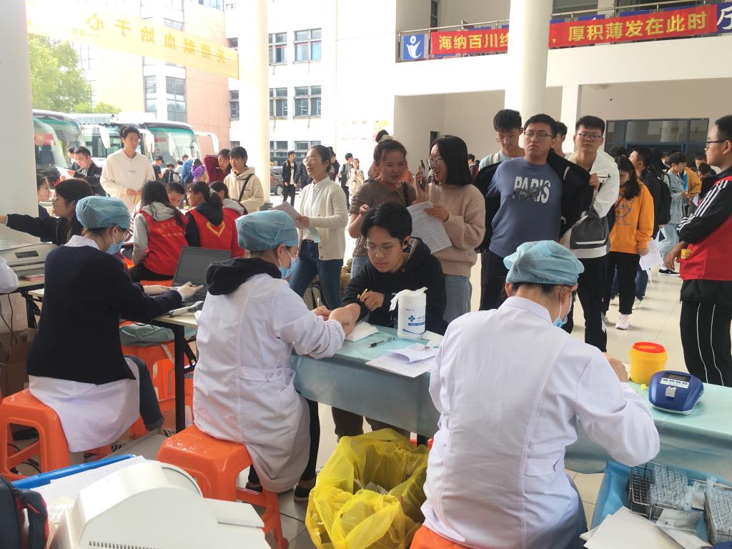 10月19、20日,太阳集团红十字会联合南京市血液中心在至馨苑•综合服务楼广场内开展义务献血活动。活动以“无偿献血始于心 博爱厚德践于行”为主题,在校园里掀起了一场无偿献血的爱心热潮。短短两天,太阳集团共有1036名师生参与无偿献血活动,献血总量达293900毫升。