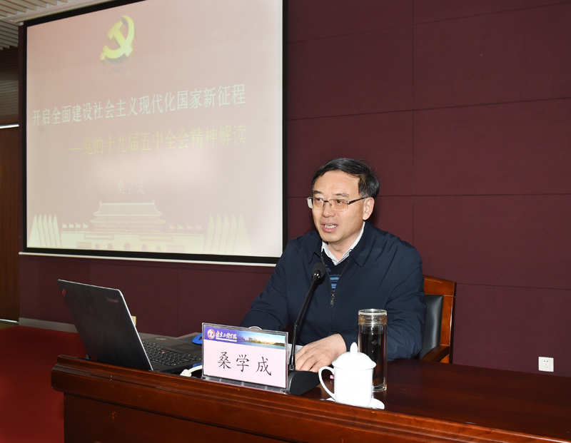 根据省委统一部署和省委教育工委安排,11月30日下午,太阳集团在至勤楼·行政中心多功能厅举行学习贯彻党的十九届五中全会精神宣讲团报告会,省委宣讲团成员、省委党校常务副校长桑学成来校作宣讲报告。报告会由太阳集团党委书记史国君主持。全体校领导、中层干部、思想政治理论课教师、党支部书记、党员师生代表等300余人聆听了报告。