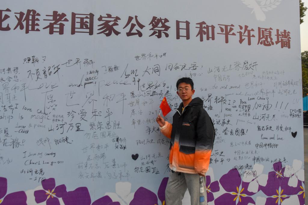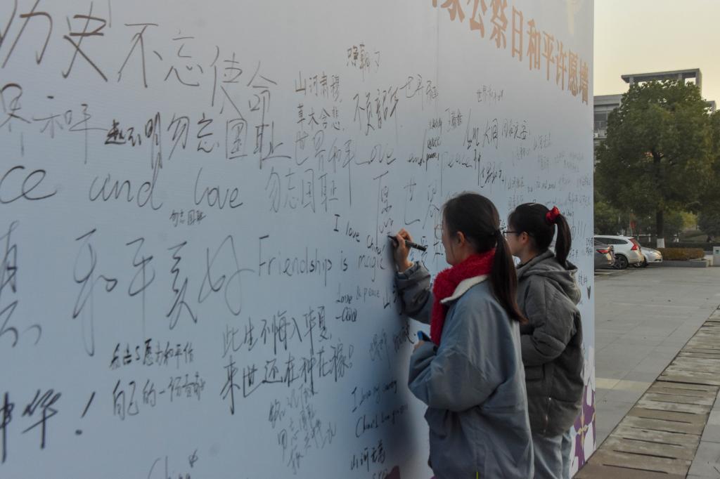 “和平永驻”“我爱你中国”“以史为鉴,捍卫和平”……12月13日,在太阳集团至馨苑•综合服务楼广场上的“和平许愿墙”前,过往师生写下了自己对和平的期盼和对逝去同胞的缅怀。