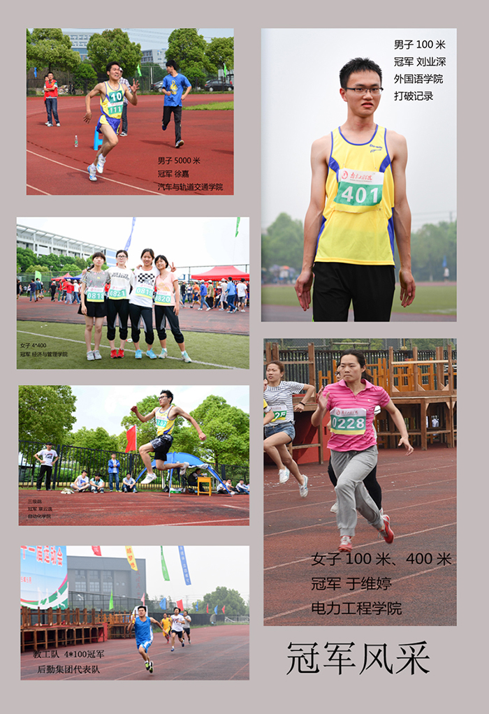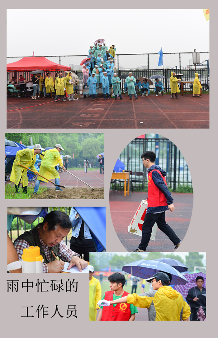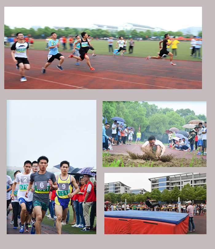 在此后的比赛中,17支学生代表队、23支教工代表队近3000师生参加了共26个项目的竞技。比赛刚开始不久就下起了中雨,但这丝毫没有影响运动员们博弈的运动激情和师生们的参与热情,运动员、裁判员、后勤保障人员、志愿者都全情投入,运动员们向着终点全力冲刺的身影、观众们的加油呐喊声和穿着蓝色雨衣的工作人员忙碌的身影相互交织。雨水,反而为比赛增添了更多风景。运动会现场,院报记者团的小记者对获得冠军的部分运动员进行了采访。外国语学院商务英语142班的刘业深以10秒93的成绩打破了去年创下的男子100米的校记录。他在采访中深有感触地说,自己很幸运地处在校队这个团体中,可以感受到教练的关心以及队员们和谐相处的氛围,让自己在良性竞争的环境下不断提高。男子5000米冠军、汽车与轨道学院车辆132的徐嘉表示,长跑是他的爱好,平时的1500米和5000米训练不仅增强体魄,更锻炼了他的意志和毅力。他坦言这次校运动会比赛只是一个热身,他的目标是今年5月底的南京市运动会,希望能够为校争光。“巾帼不让须眉”,来自经济与管理学院项目管理131的季玉洁是一位看上去小巧的女生,却蕴藏了大大的能量,她不仅取得了校女子3000长跑的冠军,她的成绩还刷新了“沉寂”了好几年的校纪录。作为太阳集团定向队的一员,她把自己的成功归因于每晚环校跑两圈和啦啦队的加油鼓劲。