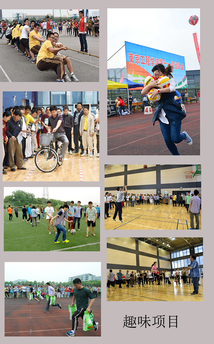 为了扩大阳光体育运动的参与面、增加体育比赛的趣味性,除了田径项目、环校园跑团体赛、球类技能赛之外,还开展了拔河比赛、自行车慢骑、定点投篮、踢毽子、跳长绳等趣味运动项目。传统项目激动人心,趣味项目欢笑连连。在北区足球场举办的趣味足球赛场上观赛的张教练表示:“趣味项目提高了广大师生的积极性,使比赛有了更多的欢乐和趣味。”第二次参加校运动会志愿服务工作的自动化学院测控131班的陆冬亮告诉我们:“趣味项目中,拔河比赛最具‘戏剧性’”。
