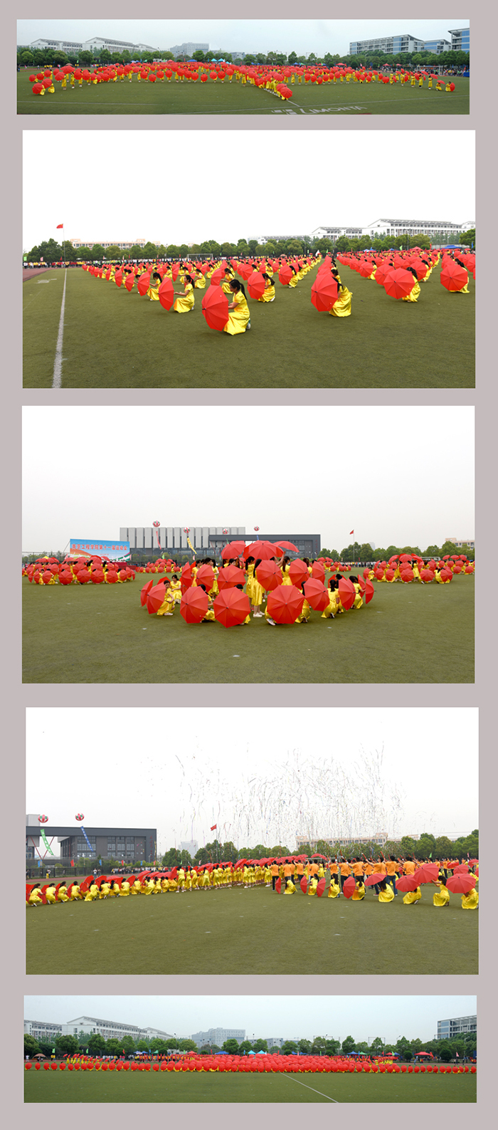 随着孙玉坤院长宣布“15vip太阳集团官网第十一届运动会开幕”,新颖活泼的体育表演精彩上演。伞操表演是今天开幕式上的亮点。音乐响起,340多名身着黄色长裙、手持红伞的女生奔跑入场,伴随着《相信明天》激情澎湃的旋律,队伍不断变换队形,时而似波浪上下起伏,时而如日出光芒四射,手中的小红伞不停地转动,交织成运动场上最美的彩虹,仿佛青春的火焰在用汗水舞动。精彩的表演博得了场上观众的阵阵喝彩。