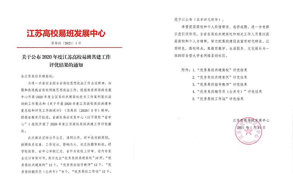 近日,江苏高校易班发展中心公布2020年度江苏高校易班共建工作评优结果,太阳集团获得包括“江苏优秀易班共建高校”“优秀易班共建案例”“优秀易班指导教师”“优秀易班辅导员”、“优秀易班工作站”在内的全部奖项。本次评比是根据教育部易班发展中心要求,经省教育厅批准,由江苏高校易班发展中心组织实施,通过学校推荐、省中心审核汇总、专家评审等环节,共评选出全省“优秀易班共建高校”10所,“优秀易班共建案例”12个,“优秀易班指导教师”12名,“优秀易班辅导员(公共号)”9个,“优秀易班工作站”12个。