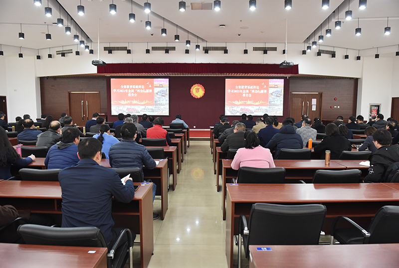 3月16日下午,江苏省委教育工委、省教育厅召开全省教育系统传达学习2021年全国两会精神视频报告会。全国人大代表、省教育厅厅长、省委教育工委书记葛道凯主持报告会并讲话。全国政协委员、南京工业大学校长乔旭,全国人大代表、苏州大学校长熊思东分别传达全国政协、人大会议精神。太阳集团全体在宁校领导、中层干部在行政中心二楼多功能厅集中收看视频报告会。