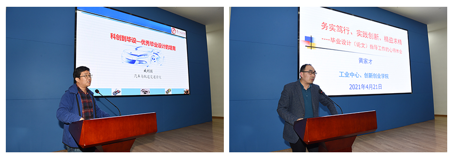 优秀指导教师代表黄家才、臧利国老师分别做交流发言,从论文题目的选择、论文的修改、教师的指导等方面谈了各自的心得体会,并介绍了自己在论文指导实践中所获得的经验。围绕制定优秀毕业设计(论文)成果培育管理办法、学生科创成果数据平台建设与运用等方面提出了意见和建议。