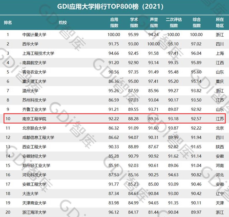 自2016年首次发布以来,GDI系列大学排行榜依托主流媒体的第三方评价机制,以客观、专业、前瞻为原则,赢得高等教育领域内外的广泛关注和认可,成为品牌影响力领先的中国大学排名。今年的榜单继续沿用应用指数、学术指数、声誉指数和二次评估指数四大评价指标,遵循数据可采集、易采集、具权威性的原则,采集893所本科院校2016年至2020年的办学数据以构建评价数据库。应用指数是“GDI应用大学排行榜”的重要创新,旨在评价高校在社会服务方面所做的贡献,重点从科研创新成果转化、人才培养质量等方面衡量高校办学成效。
