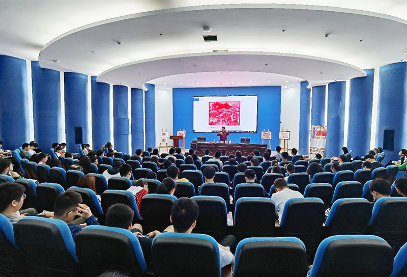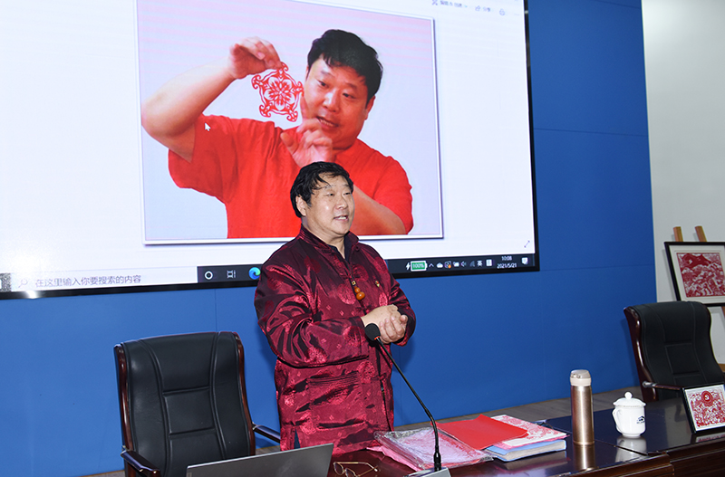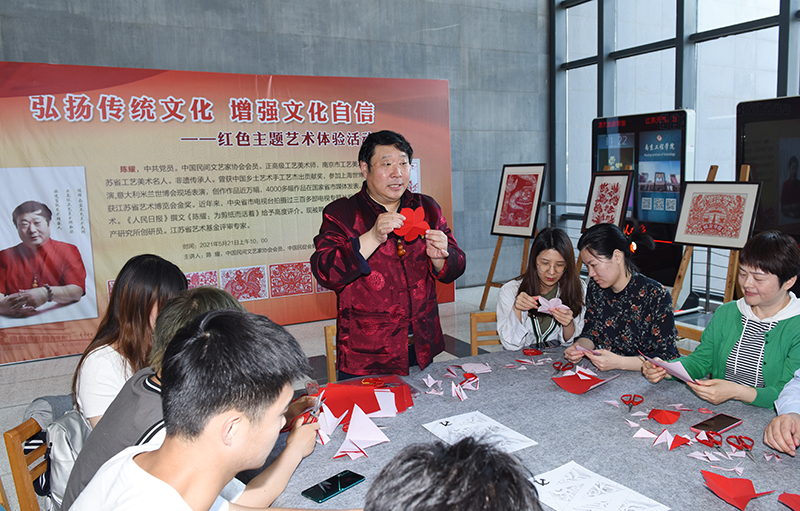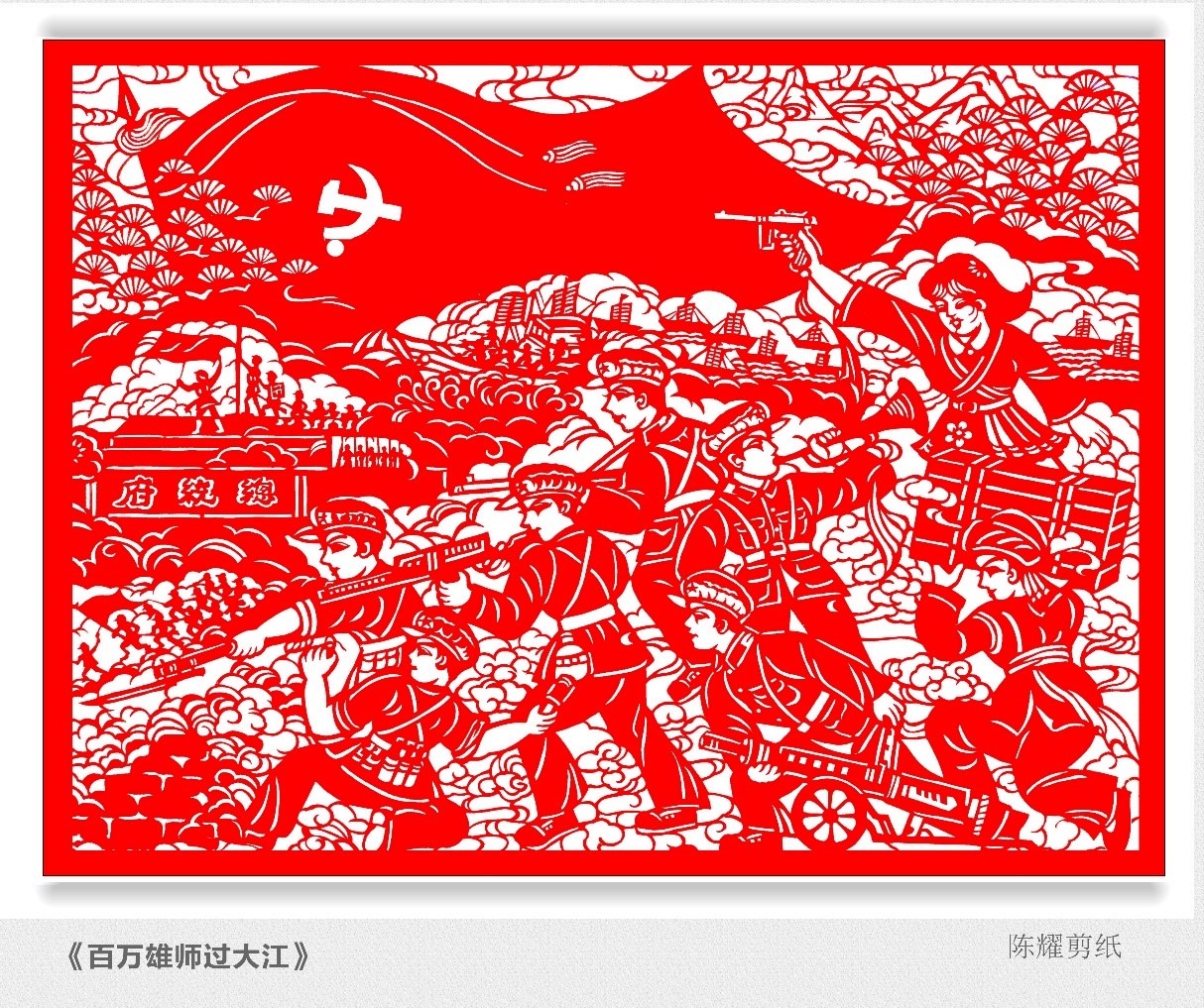 在这堂别开生面的传统文化课上,陈耀为师生们介绍了剪纸艺术的历史渊源、剪纸艺术的特点和技巧,强调剪纸对人格培养、对增强文化自信的重要性。在全国上下迎接中国共产党百年华诞之际,恢弘厚重的百年党史给了他源源不断的创作灵感和创作激情,除了《百万雄师过大江》之外,他还向师生们展示了《热烈庆祝中国共产党百年华诞》《百年伟业与天齐寿》《剪个窗花献给党》《各族人民心向党》《普天同庆感恩党》《献瑞图》等将党的光辉历程与剪纸艺术相结合的作品。通过这些作品的展示与解读,陈耀重点介绍了剪纸作品中的红色元素,重大历史事件题材的选择与创作。