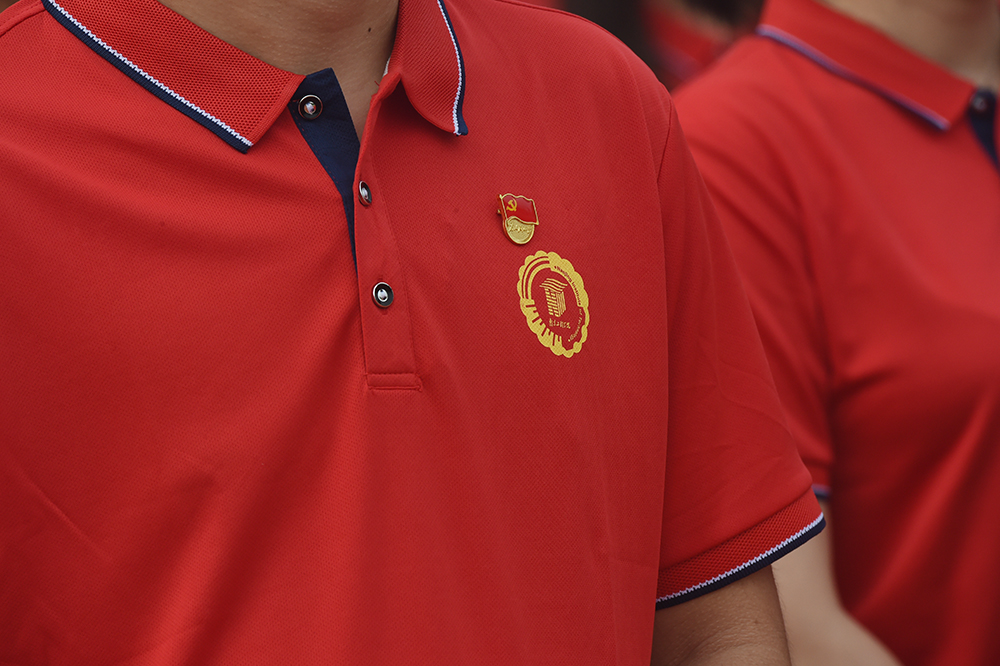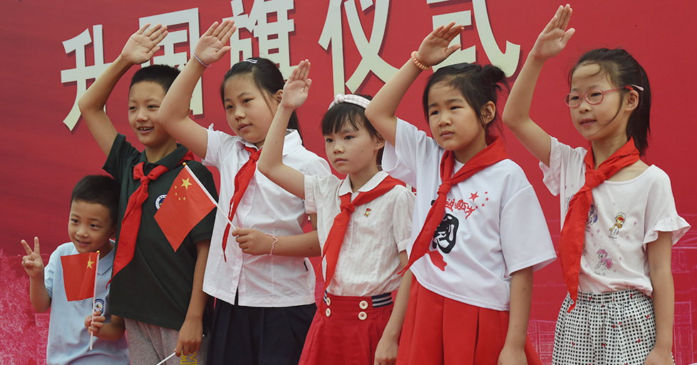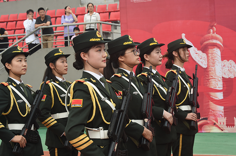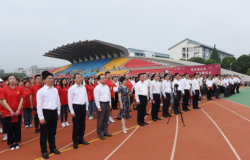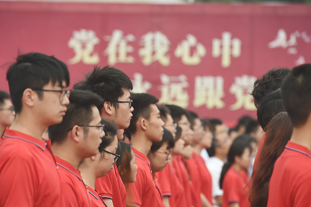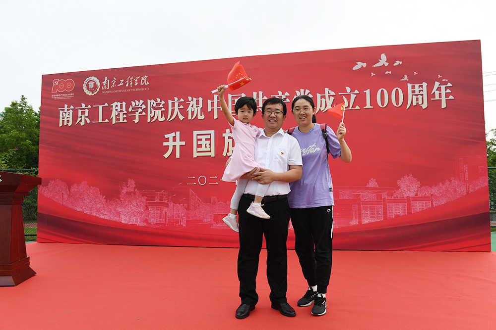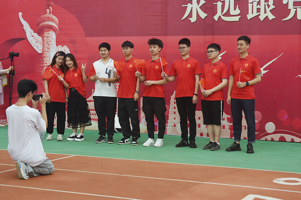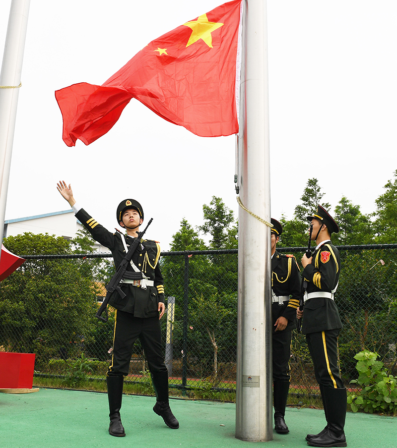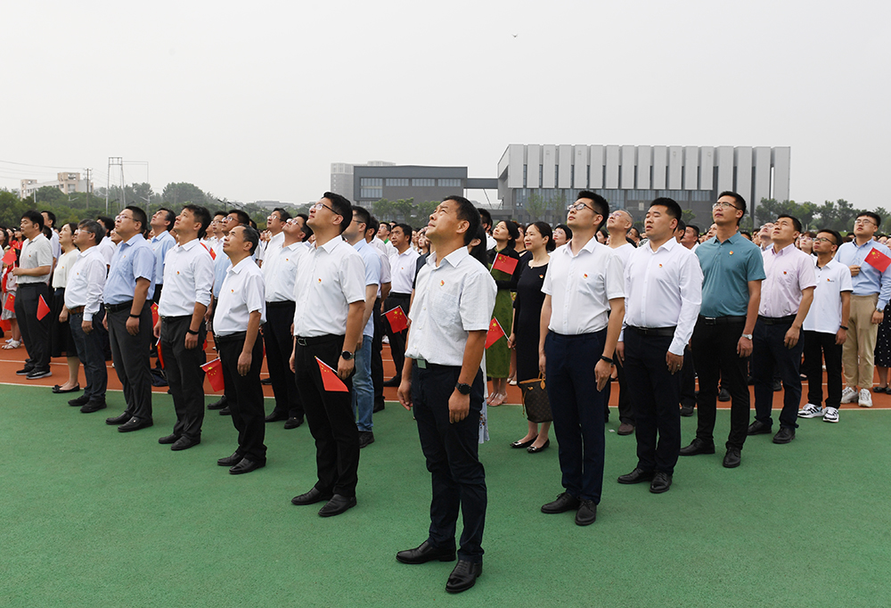 伴随着雄壮豪迈、振奋人心的《义勇军进行曲》,五星红旗冉冉升起。全体师生神情专注,目光坚毅。在昂扬的国歌声中,每一名党员胸前的党徽熠熠生辉。“党的100周年是一幅波澜壮阔的历史画卷,更是一片赤忱热血的初心坚守,是信仰之光熠熠生辉。”在场党员无不为之骄傲,在心中默默传递着对党、对祖国的由衷热爱和真挚祝福。
