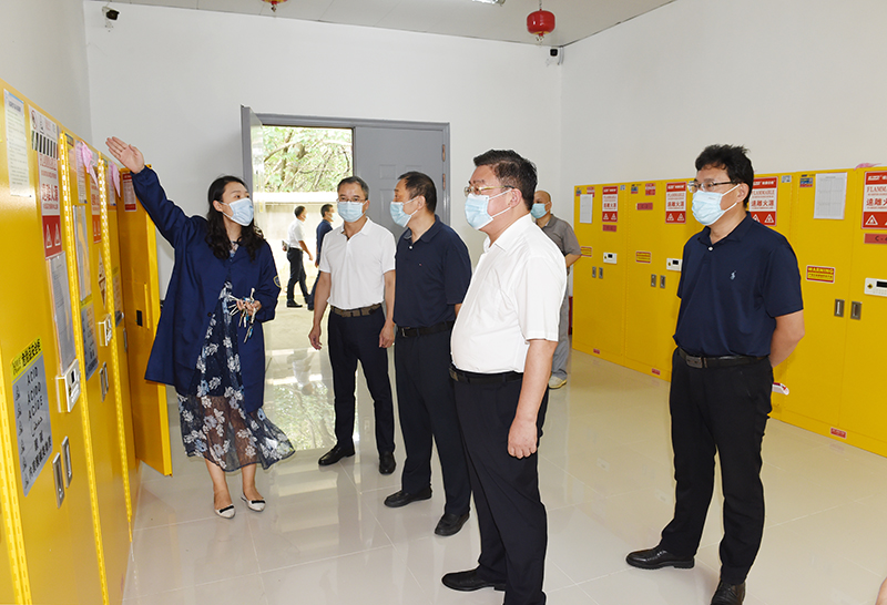 在学校危化品仓库,校领导一行现场对学校实验室危险化学品管理的风险点一一排查,同时要求仓库管理人员要严格落实“双人双锁”原则,加大核查力度以及登记制度,不断加强实验室安全建设,提升危险化学品规范化管理水平,将安全隐患降到最低。