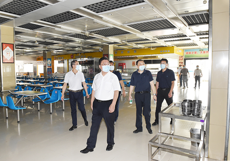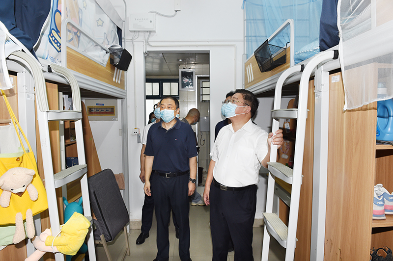 校领导一行还察看了学生宿舍、学生食堂等施工改造现场。利用暑期“黄金期”,学校同时推进学生宿舍出新、学生公寓空气源热泵洗浴系统更新、学生食堂装饰装修改造等多项维修专项工程落实。目前,各类改造工程均已进入倒计时收尾阶段。校领导们每到一处,都要与相关负责人及施工人员亲切交流,详细了解各项目建设情况,并对相关细节提出整改要求,要在做好疫情常态化防控工作的前提下,坚持安全第一,质量为本,按时保质完成工程建设任务,确保为返校师生提供更优质的生活设施保障。