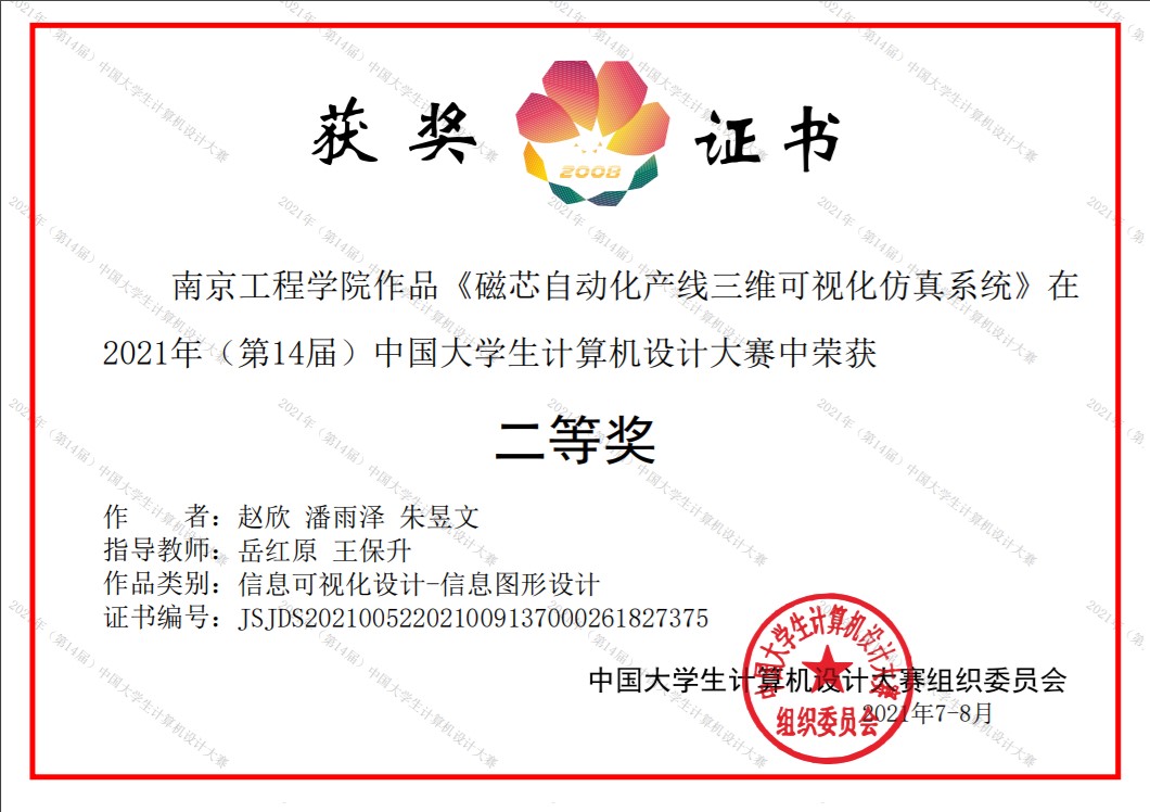 日前,“第十四届中国大学生计算机设计大赛”全国总决赛落下帷幕。太阳集团参赛团队获得二等奖一项,三等奖一项的好成绩。其中,计算机工程学院赵欣、朱昱文与机械工程学院潘雨泽在岳红原、王保升老师的指导下,制作的参赛作品《磁芯自动化产线三维可视化仿真系统》荣获二等奖;计算机工程学院孙乐乐、鲍耀龙和陈路佳,在刘一丹和卢阿丽老师指导下,制作的参赛作品《检·约》荣获三等奖。