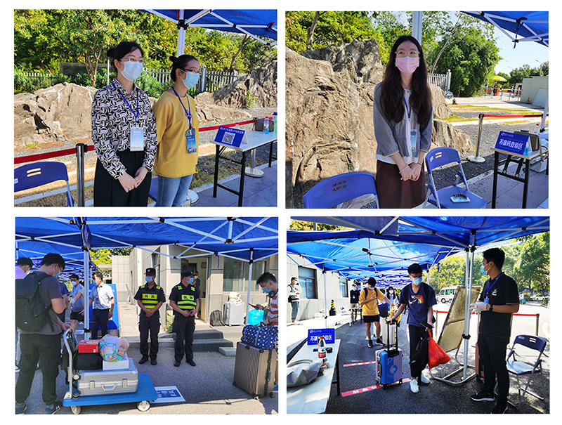 返校当日,学校开放二号门、三号门、四号门迎接学生入校。清晨,来自党办校办、学工处、保卫处、门诊部、后勤保障处等多个部门的负责人和工作人员早早就位,有序迎接归家的学子,现场秩序井然、有条不紊。今日校园APP扫码签到、学生身份核验、苏康码、核酸检测阴性证明查验、体温检测……每一个简单的查验环节都渗透着师长的关怀与呵护;每一道平常的入校程序都映射着学校关爱与期待。尽管衣衫早已被汗水浸湿,皮肤也已被烈日晒红,但是工作人员毫不在意,每一份坚守只为学生能够绽放出满意的笑容。