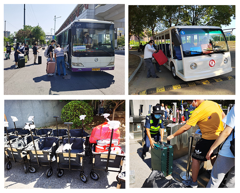 秋意清浅,骄阳如故,为了更好地服务于乘坐公共交通工具的学生返校,学校在江宁高新区的支持下在南医大▪江苏经贸学院地铁口设置接站点;在二号门与四号门设置小公交接驳车。公交师傅亲切地问候每一位归来的学子,每当看到学生行李多,便不顾满头的大汗赶上前帮忙提拿。为方便学生搬运行李,学工处还体贴地准备了近70辆手推车。周到细致的服务只为助力学生新学期顺利起航。