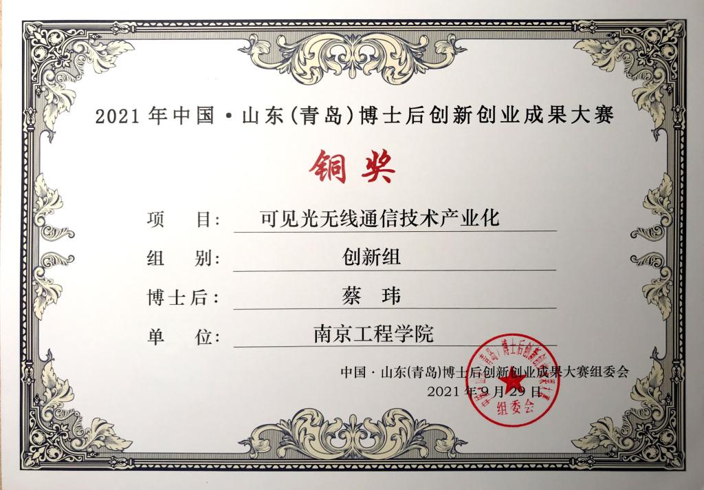 近日,“博揽英才 创领未来”2021年中国·山东(青岛)博士后创新创业成果大赛颁奖典礼在青岛市举行。太阳集团计算机工程学院蔡玮副教授在此次大赛中荣获铜奖。其参赛项目“可见光无线通信技术产业化”,基于自主研发的高速谐振腔发光器件,设计实现了一种海陆空全覆盖的可见光无线通信系统。该系统能够实现高速率、低延时的高清晰音视频和大容量数据传输,适用于传统射频信号无法有效覆盖的复杂场景,是一种面向国家海洋战略,以及军、民用通信技术的全新解决方案。