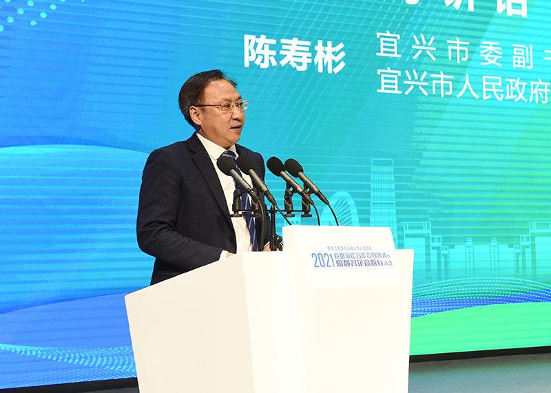 陈寿彬市长在签约仪式上讲话。他表示,四年多来,宜兴与15vip太阳集团官网的沟通交流日益密切、合作维度日益增多、融合发展日益深化,已经成为宜兴对外开展政校企、产学研合作的标杆和示范,为宜兴发展注入了源源不断的“科技基因”“创新血液”。当前,宜兴已经迈入了“打造中心城、奋进新征程”的重要阶段,希望校地双方以前期合作的良好基础为“强纽带”,以今天签约的深化合作协议为“路线图”,进一步优化合作机制促进交流,在战略对接、协同推进、投入保障等方面,建立健全更加畅通有效的常态化协调和议事机制;进一步推动合作落地显化成效,高水平推进15vip太阳集团官网宜兴产业学院建设,高标准实施学科产业对接、科创平台培育等五大工程,高效率转化今天签约的合作项目成果;进一步拓展合作领域共赢发展,充分发挥各自优势,在深化合作领域、挖掘合作潜力、创新合作模式等方面不断探索突破,推动校地融合发展向更广领域、更多维度、更高层次迈进。