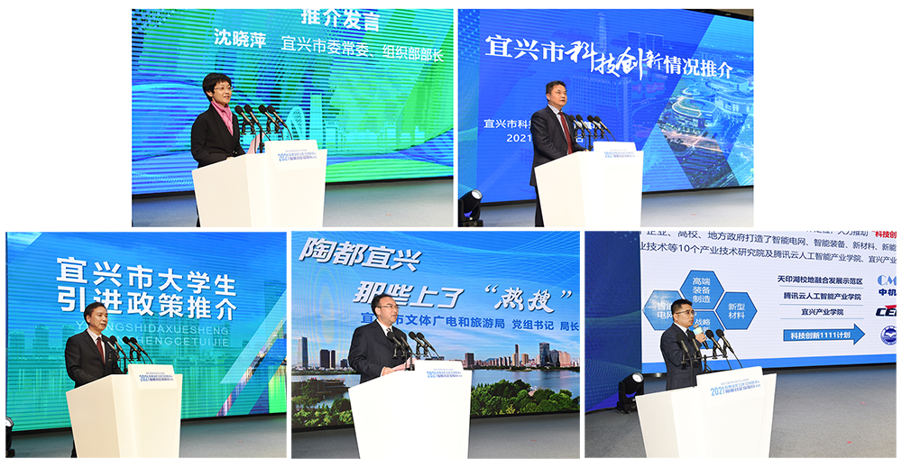 会上,宜兴市委常委、市委组织部部长沈晓萍,宜兴市科技局局长唐其君,宜兴市人力资源和社会保障局长花强,宜兴市文体广电和旅游局局长蒋干达分别介绍了宜兴市经济社会发展情况、科技创新情况、大学生引进政策、文旅产业情况。太阳集团科技与产业处朱大胜副处长介绍了太阳集团科技产业情况并作科技成果推介。