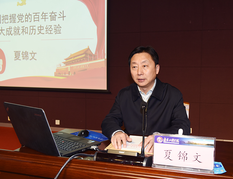 报告会上,夏锦文以“深刻把握党的百年奋斗重大成就和历史经验”为题,从“深刻认识‘一个主题’的丰富内涵”“深刻认识‘两个确立’的重大意义”“深刻认识‘三次历史性飞跃’的真理力量和实践伟力”“深刻认识‘四个伟大成就’的历史性贡献”“深刻认识‘五条历史意义’的价值所在”“深刻认识‘十个坚持’的根本经验”六个方面,对六中全会精神进行了系统解读和深入阐释。报告主题鲜明、视野开阔、内涵丰富、论述透彻,既有理论上的深度分析,也有工作中的经验体会,更有马克思主义认识论方法论的阐释,对全校师生深刻理解党的十九届六中全会精神,推进一流应用型工程大学建设,谱写学校事业发展关键时期的新篇章,具有重要的指导意义。