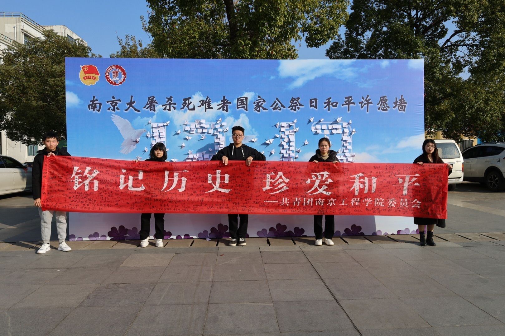 在至馨苑•综合服务楼广场,校团委组织开展国家公祭日“和平许愿墙”签名悼念活动。“铭记历史,自强不息”“愿世界和平”“吾辈自强”……在南京大屠杀死难者国家公祭日“和平许愿墙”前,过往师生纷纷驻足,在留言便签上和横幅上写下了对死难同胞的缅怀,对保卫和平的坚定信念。纸鹤传情,悼念三十万遇难同胞;字词铿锵,书写十四亿和平心愿。