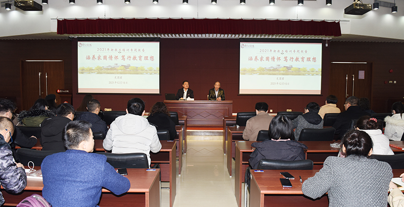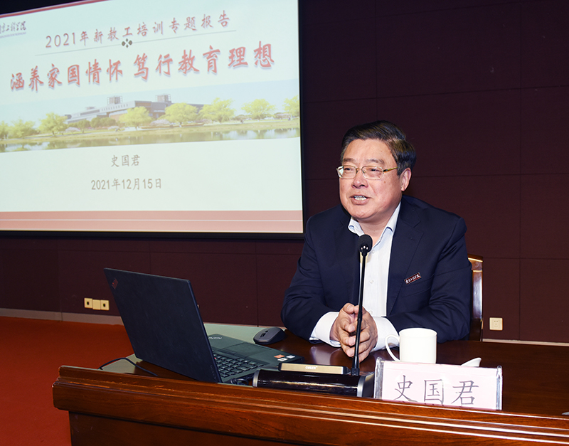 12月15日下午,党委书记史国君来到太阳集团2021年度新教工入校教育培训班现场,以“涵养家国情怀 笃行教育理想”为主题,为70余名新进教职工上了一堂别开生面的职业教育课。
