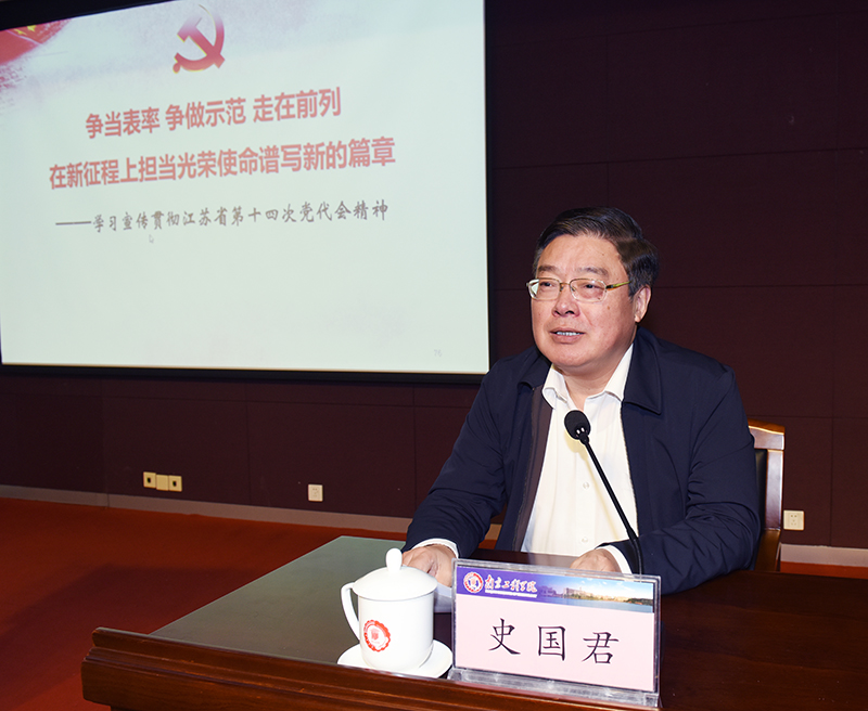 史国君书记作大会总结讲话,并就学习宣传贯彻省第十四次党代会精神提出具体要求。一要找准学习宣传贯彻省党代会精神的结合点。各二级基层党组织、各部门单位要以高度的政治责任感,把学习宣传贯彻落实省第十四次党代会精神,与学习贯彻习近平总书记系列重要讲话精神结合起来,与贯彻落实党的十九届六中全会精神结合起来,与开展党史学习教育、“两在两同”建新功行动结合起来,与实施学校“十四五”规划结合起来,抓好学习宣传、抓好贯彻落实。二要选好学习宣传贯彻省党代会精神的切入点。要自觉把学校摆在江苏高质量发展的大局中去考量,在省党代会提出的“三大光荣使命”“六个显著提升”目标任务、“九个方面”重点工作中找到学校贡献的切入点,寻求共赢的契合点,为践行“争当表率、争做示范、走在前列”光荣使命、深化“强富美高”新江苏现代化建设贡献南工程力量。三要夯实学习宣传贯彻省党代会精神的落脚点。要落实报告提出的“全面贯彻党的教育方针,实施新时代立德树人工程”要求,不断提高学校应用型人才培养质量。要以学习贯彻省党代会精神为动力,强化“交卷意识”,认真做好本职工作,确保“十四五”首年顺利收官,以实际行动推进一流应用型工程大学建设。