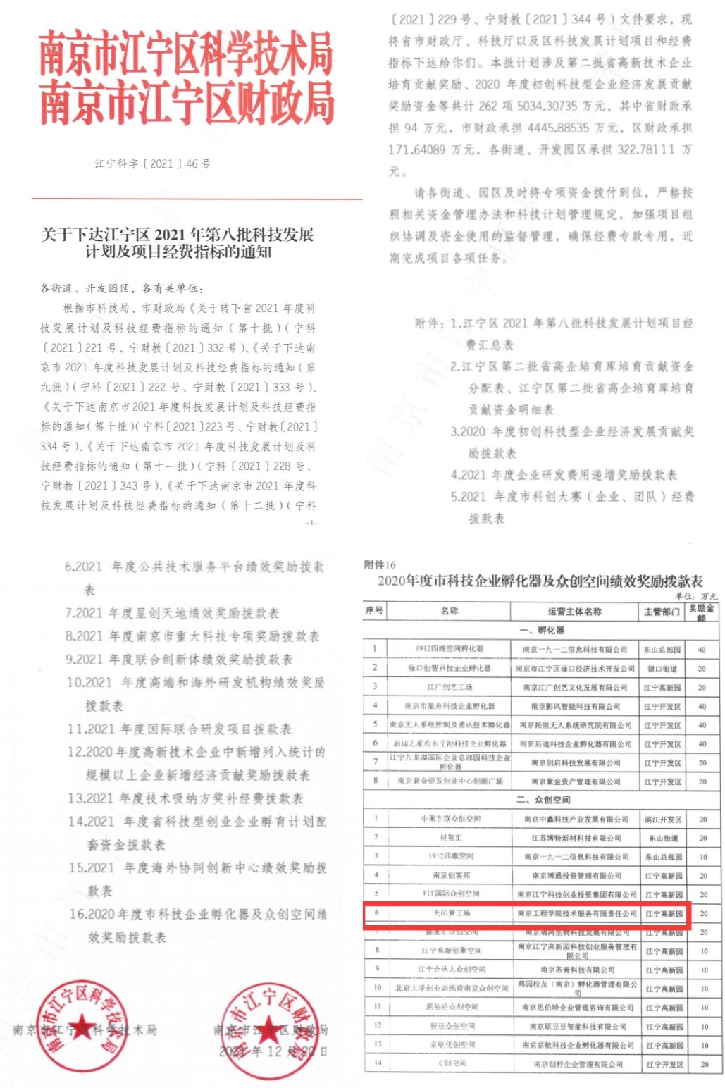 日前,南京市科技局公布了2020年度南京市众创空间绩效评价结果,太阳集团大学生创业园“天印梦工场”获评优秀等次,这是太阳集团第四次荣获市级最高评价等级。2020年度市级众创空间绩效评价由南京市科技局组织,对纳入本次绩效评价范围内的全市众创空间进行评选,设置“优秀”、“良好”、“合格”和“不合格”四个等次。经过载体申报、形式审查、专家评审和综合评审等程序,包括太阳集团天印梦工场在内的17家单位绩效评价结果为“优秀”,22家单位绩效评价结果为“良好”。