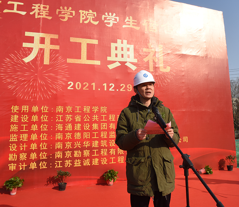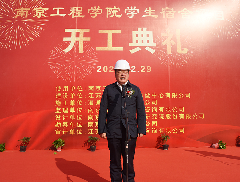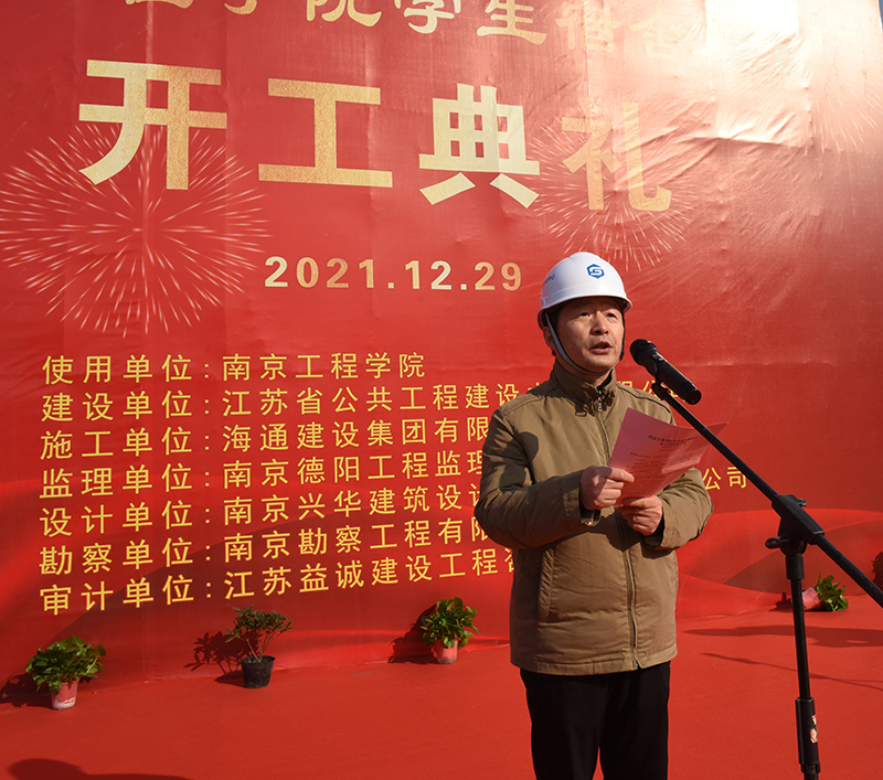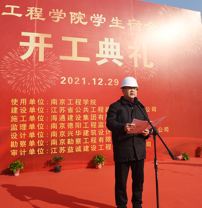开工仪式在位于校园北侧学生生活区的项目现场举行。太阳集团党委书记史国君,党委常委、副院长杨征宇、朱晓春,省住房和城乡建设厅集中建设处处长曹良春,省公共工程建设中心有限公司副总经理娄永峰,海通建设集团有限公司总经理董善勤,南京兴华建筑设计研究院股份有限公司院长陈卫新,南京德阳工程监理咨询有限公司副总经理方明,南京勘察工程有限公司总工李树德,江苏益诚建设工程咨询有限公司总工汪义平等出席开工仪式。开工仪式由省公共工程建设中心工程管理部副总经理梁石主持。