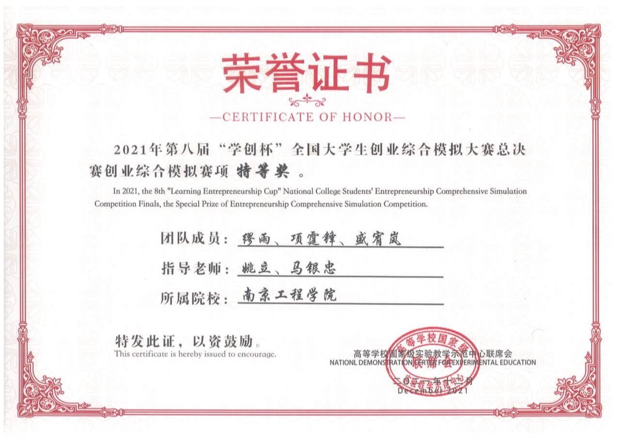 近日,第八届“学创杯”全国大学生创业综合模拟大赛全国总决赛在云南大学滇池学院落下帷幕。经济与管理学院缪雨、项霆锋、盛宥岚三位同学组成的“饭团”队在经济与管理学院姚立、机械工程学院马银忠两位老师的指导下顺利通过校赛、省赛、国赛的严格考核,从全国1075所高校超过3万支队伍中脱颖而出,喜获全国总决赛特等奖。