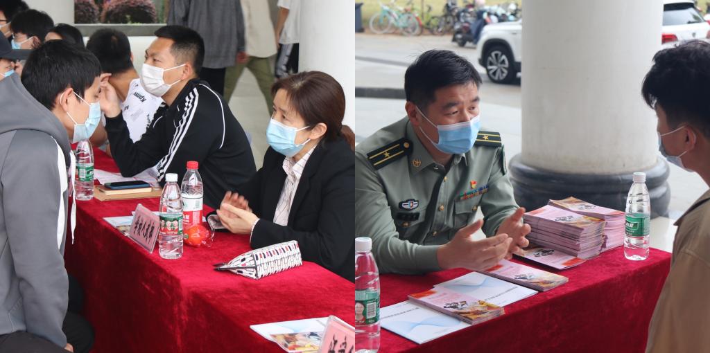 在本次咨询会上,江宁区人武部车军良副部长一行四人专程到现场与有意向报名应征入伍的毕业生进行面对面交流。通过详实的数据与生动的事例,详细解答毕业生应征入伍的相关政策,回答同学们关于部队训练、发展通道等问题,现场同学反响热烈。