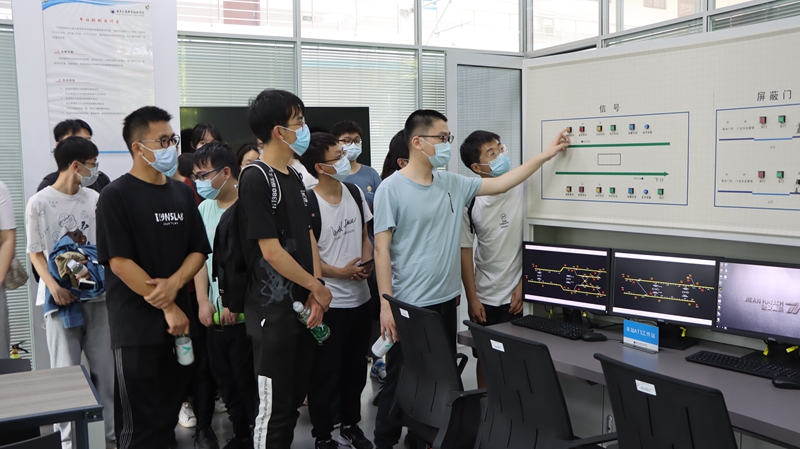 在贾俐俐书记的陪同下,史国君书记带领交运191班同学先后来到该校空乘实训基地和轨道实训基地进行参观,详细了解该校在交通运输行业专业型人才培养中的创新举措与特色成效。在空乘实训基地,相关教师为师生一行介绍了空乘专业的培养方案,大家从日常课程中感受专业教育的职业化与规范化。史书记与同学们重点参观了城市轨道交通综合实训室,该实训基地为省交通运输厅职业教育实训基地,以南京地铁“一号线”为原型,“一比一”还原地铁站台与车厢环境。师生们先后参观并体验了地铁模拟驾驶室、地铁运营调度室、地铁站台运营控制系统等仿真系统,帮助同学们从书本理论知识延伸到实践认知操作,进一步深化了专业教育。
