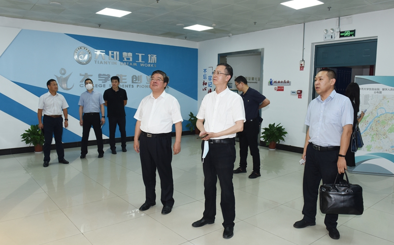 会前,调研组一行参观了大学生创业园“天印梦工场”。史国君书记介绍了太阳集团近年来的学生创新创业工作,史书记表示,太阳集团十分注重在校学生的创新创业能力培养,将创新创业教育融入人才培养全过程,使学生不出校门就能进行创业训练,走出宿舍即能体验创新精彩。通过十余年的教育与实践,构建了“创新推动创业,创业激励创新”的良性互动机制,营造了“生师互融共创,学生抱团发展”的浓郁创新创业氛围。