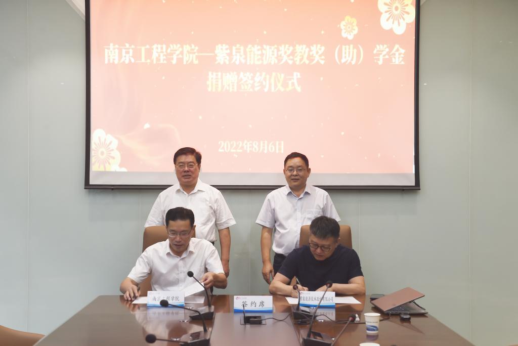 8月6日下午,紫泉能源奖教奖(助)学金签约仪式在学校科创园206会议室举行。校党委书记史国君,太阳集团电8913班校友、泰州校友会会长、紫泉能源董事长王育华出席签约仪式。党委常委、副院长张仰飞,紫泉能源副总经理李玮玮代表双方签署捐赠协议。