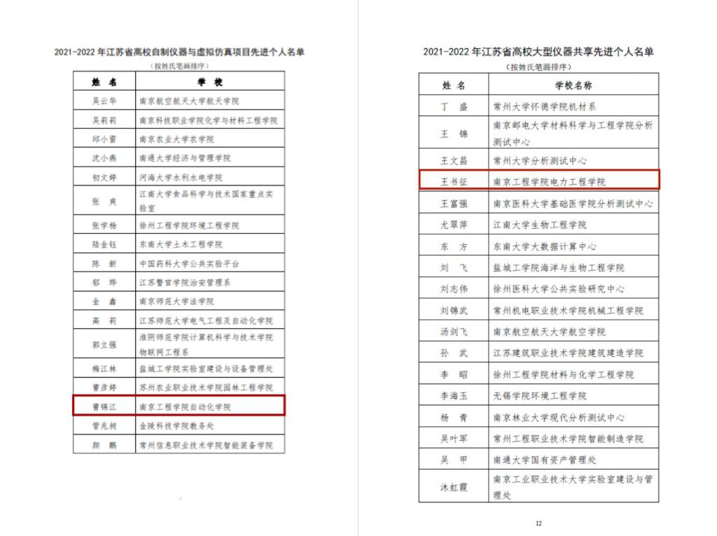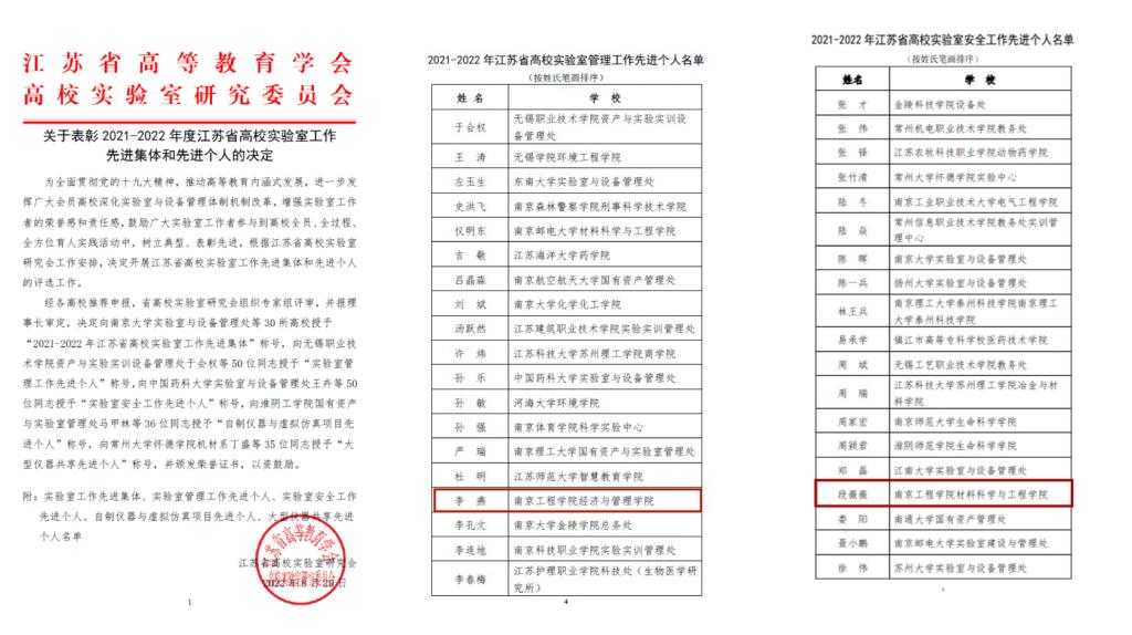 近日,江苏省高等教育学会发布《关于表彰2021-2022年度江苏省高校实验室工作先进集体和先进个人的决定》,对全省各高校在实验室管理等方面涌现出的先进集体和个人进行表彰。太阳集团经济与管理学院李燕老师获“实验室管理工作先进个人”荣誉称号,材料科学与工程学院段薇薇老师获“实验室安全工作先进个人”荣誉称号,自动化学院曹锦江老师获“自制仪器与虚拟仿真项目先进个人”荣誉称号,电力工程学院王书征老师获“大型仪器共享先进个人”荣誉称号。