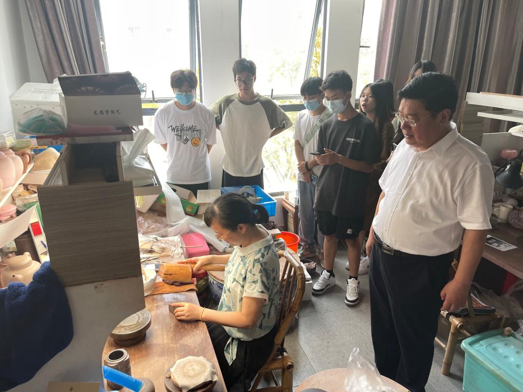 “‘买田阳羡吾将老,从初只为溪山好。’这是苏东坡的一句诗,也道出了他与宜兴的渊源。”“一项技艺的兴盛与传承,一定离不开技艺背后‘人’的努力。”在史国君书记的带领下,师生一行参观了雅达阳羡溪山小镇,走进章剑华人文空间、紫砂汇、宜兴文创中心,进一步感知宜兴的历史、环境、人文,以及蕴含其中的文化魅力与工匠精神。“自2017年10月学校与宜兴市正式签订全面战略合作协议以来,学校每年与宜兴定期开展校地专场招聘会,为宜兴输送优秀毕业生,一批校友扎根宜兴、与企业共成长,取得了优异成绩。”史书记还为同学们介绍了学校与宜兴结下的“不解之缘”,“对于工美专业同学们来说,这次的参观学习不仅是一次体验宜兴陶瓷文化的机会,更是一个深化专业教育的平台,希望同学们亲眼看、亲手触、亲耳听,让书本理论知识与实践认知操作碰撞出灵感的火花,用匠心守护传统工艺,给人以美的感受和体验。”