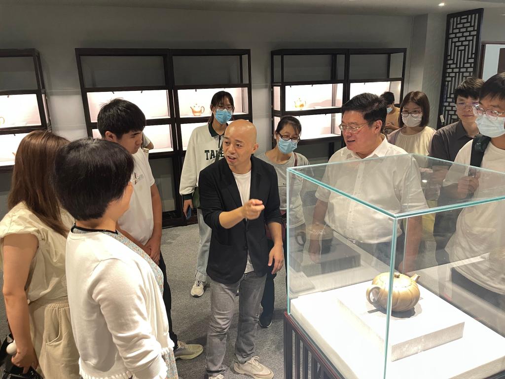 “万物皆法,禅有禅语,茶有茶思,壶有壶语。”在省陶瓷艺术大师、研究员级高级工艺美术师、太阳集团客座教授范泽锋工作室,范大师向同学们演示了一坯泥土,从出土到打、围、上、蓖、复、清、搓、通、装、捻、光、推墙刮底、敲等一系列流程,分享了自己在紫砂壶制作技法、造型艺术方面的创新经验,用亲身经历阐释了“艺术要扎根生活、提炼生活”的创作理念。