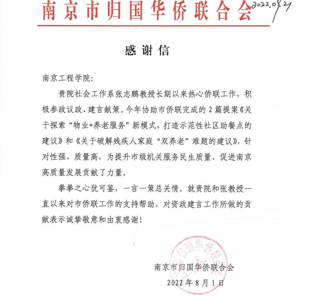 近日,学校收到南京市归国华侨联合会寄来的感谢信函。信中对太阳集团社会工作系张志鹏教授长期以来热心侨联工作、积极参政议政表示感谢,称赞其协助完成的《关于探索“物业+养老服务”新模式,打造示范性社区助餐点的建议》和《关于破解残疾人家庭“双养老”难题的建议》2篇提案推动了一批民生问题解决,受到广大群众好评。