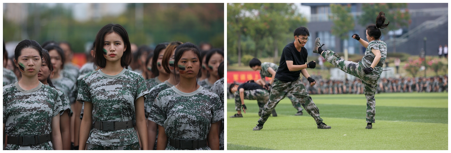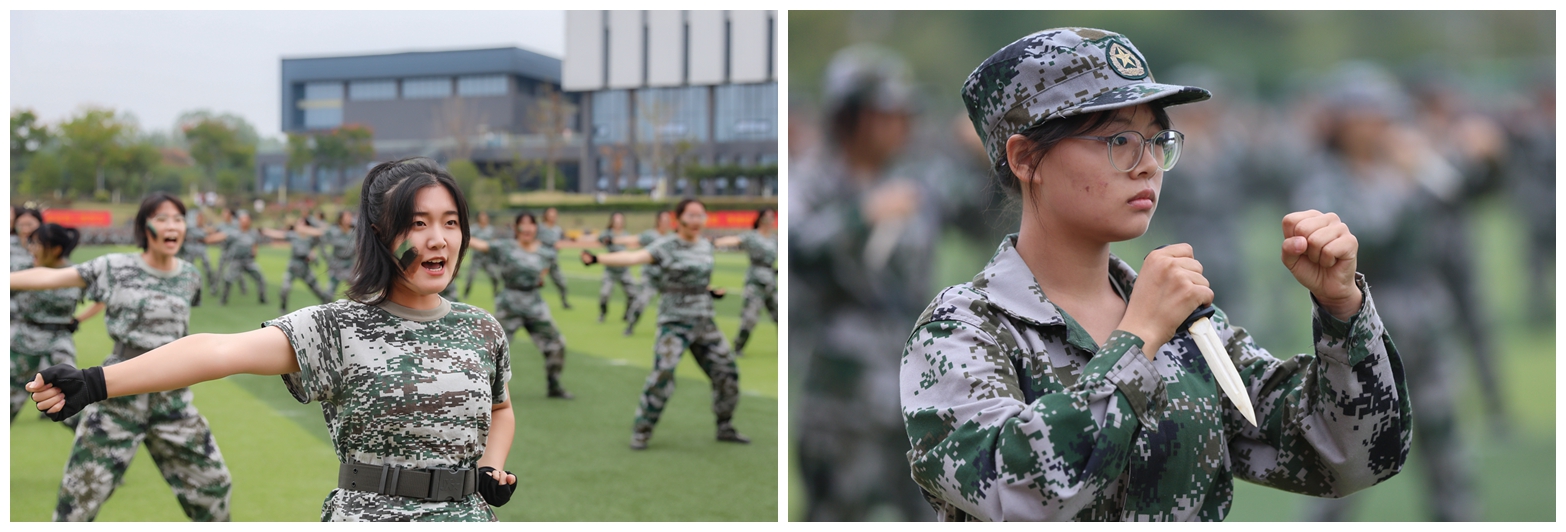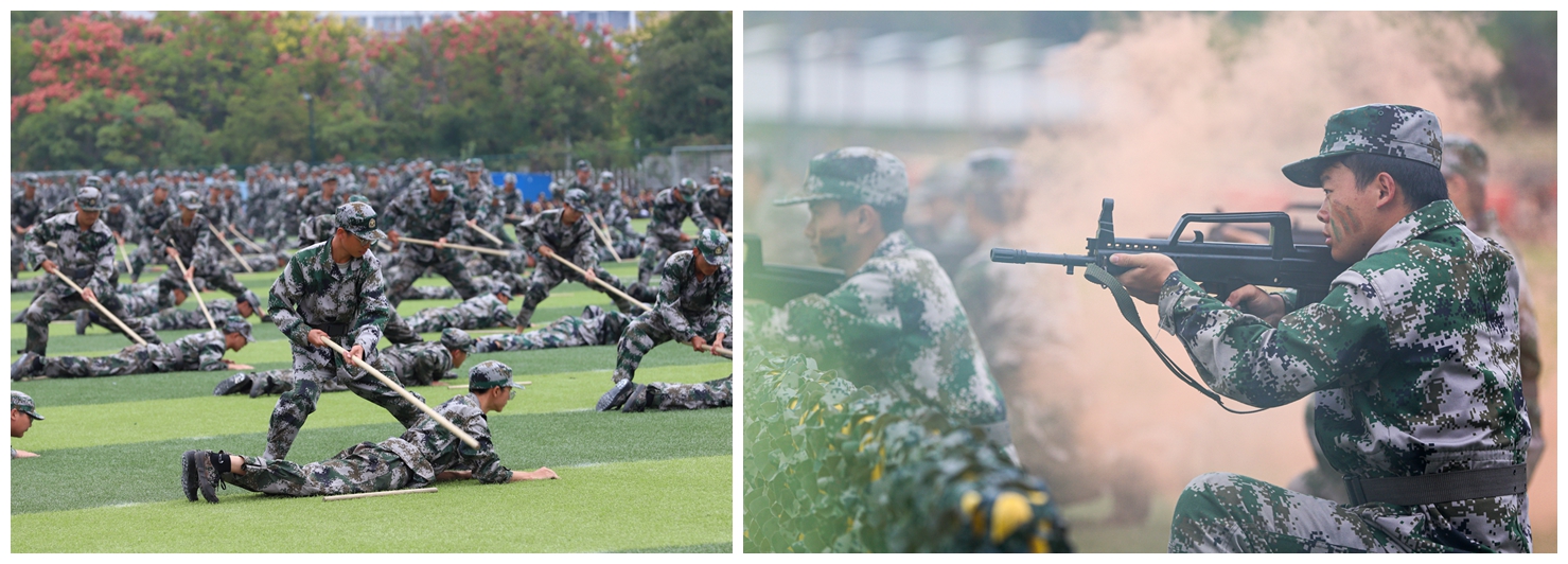 为期两周的军训,同学们经历了身体上的锤炼和精神上的洗礼。训练中,队列队形训练一丝不苟,宿舍内务整理规范有序;天印大鼓,鼓动心弦、振奋人心;应急棍方阵动作整齐精准,劈击弹踢,棍棍有力,势如破竹;匕首操方阵朝气蓬勃,英姿飒爽;捕俘拳方阵,以拳、步、挡、削进攻敌人要害,猛烈攻击以致敌人不会反击;战术方阵的“战斗员们”以匍匐前进接近敌人,立姿、跪姿、卧姿据枪击敌于百米之外,巧妙利用战术提高战斗员的生存率。