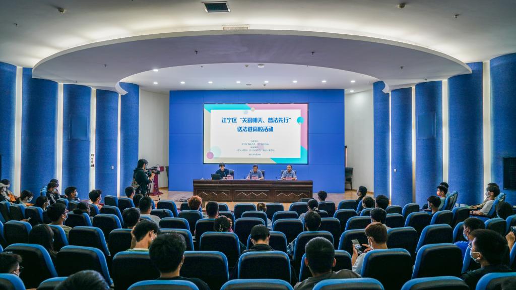 为深入学习贯彻习近平法治思想,提升全校师生法治意识和法律素养,强化依法治校基础,踔厉奋发迎接党的二十大召开,9月29日下午,学校与江宁区联合举办“关爱明天,普法先行”主题宣传活动。活动邀请南京师范大学法学院教授姜涛在图书馆学术报告厅为太阳集团大一新生开展法律专题讲座,并通过在线直播与全区师生同上“第一堂法治课”,江宁区司法局副局长苏克刚出席参加讲座。