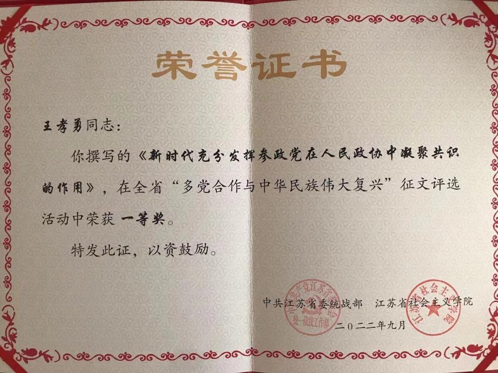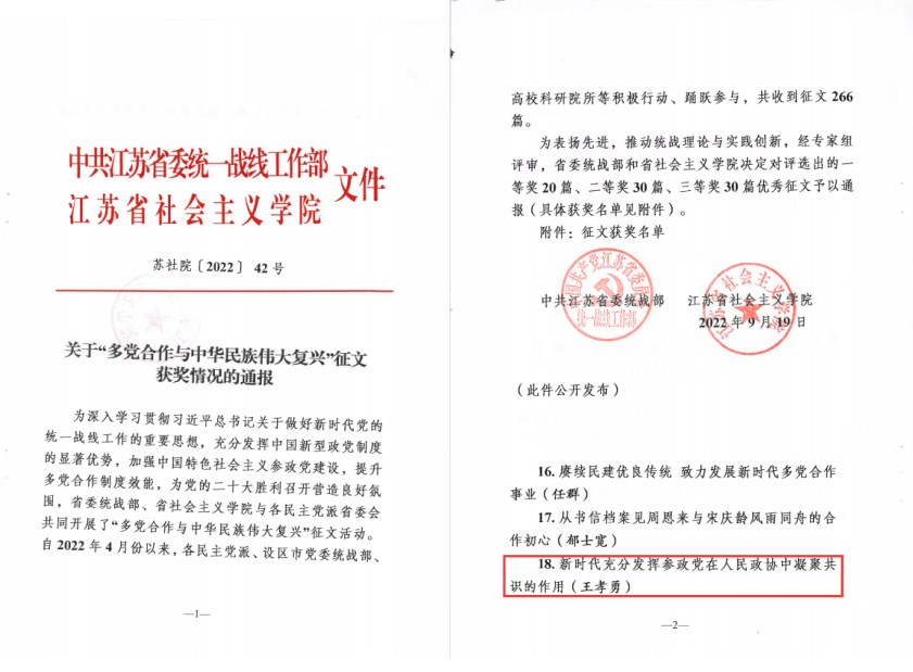 近日,由中共江苏省委统战部、省社会主义学院与各民主党派省委会共同开展的“多党合作与中华民族伟大复兴”征文获奖情况公布。太阳集团民盟总支副主委王孝勇教授撰写的《新时代充分发挥参政党在人民政协中凝聚共识的作用》荣获一等奖。