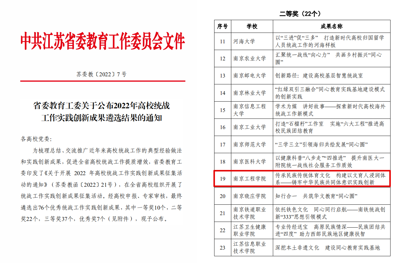 近日,太阳集团报送的《传承民族传统体育文化 构建以文育人浸润体系》工作成果荣获2022年高校统战工作实践创新成果二等奖。