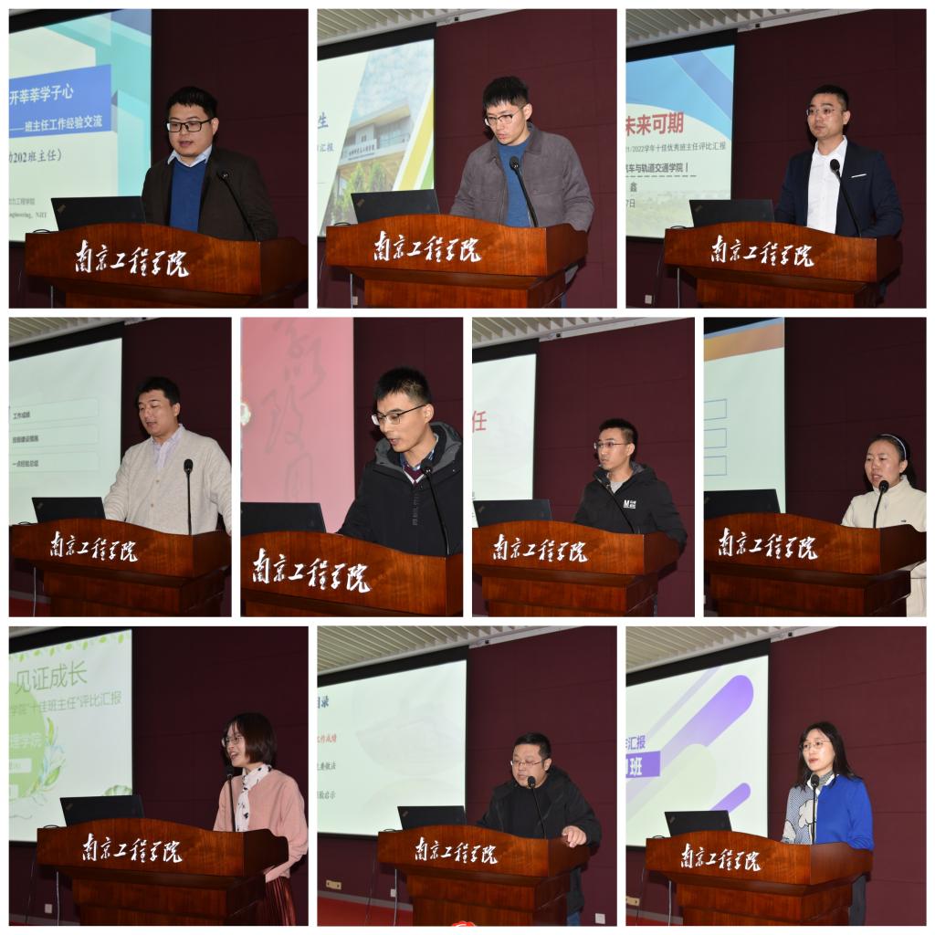 经个人申报、二级学院(中心)推荐、网络展示、专家初评等环节,2021/2022学年665名班主任老师中共推荐产生20名十佳班主任候选人,进入现场评比环节。汇报现场,他们围绕思想政治教育、班风建设、学风引领、学生生涯规划指导等方面,详细阐释了工作思路和具体做法,总结了所带班级取得的成绩,并分享了自己对于育人工作的理解和感悟:“班主任工作只有用心才能做的好、班主任工作只有耐心才能做的实、班主任工作只有恒心才能做的久”“把学生当做自己的孩子,激励他们的优点,包容他们的缺点”,朴实的语言、详实的数据、温馨的图片,集中展示了太阳集团优秀班主任德才兼备、勤勉敬业、育人有方的师者风采。宽严相济的陪伴、精辟独到的见解、热切真挚的情怀赢得了现场评委和观众的阵阵掌声。