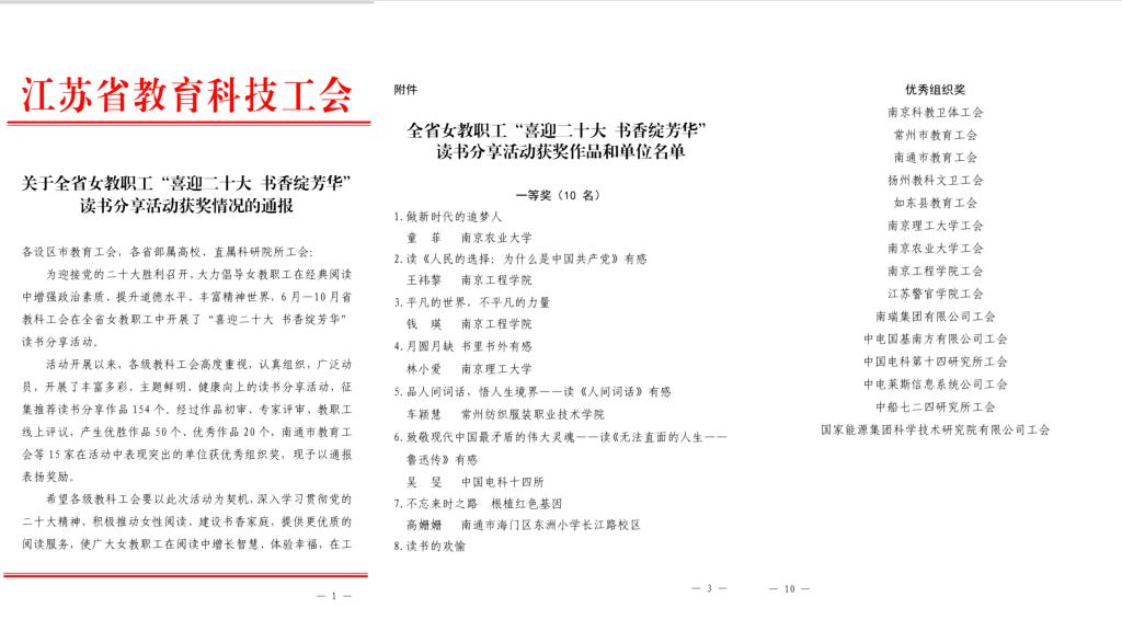 近日,江苏省教育科技工会发布《关于全省女教职工“喜迎二十大 书香绽芳华”读书分享活动获奖情况的通报》,太阳集团选送的自动化学院王祎黎老师《读<人民的选择:为什么是中国共产党>有感》和计算机工程学院钱瑛老师《书香绽芳华,在平凡中汲取力量》两部作品在全省154篇读书分享作品中脱颖而出,均获得一等奖的好成绩。太阳集团荣获优秀组织奖。