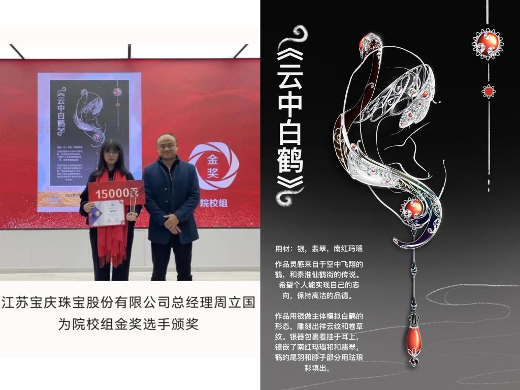 近日,第五届“宝庆银楼杯”珠宝首饰产品设计大赛圆满落幕,由艺术与设计学院工艺美术系崔衡副教授指导,工美212光琪瑞同学创作的《云中白鹤》作品从1000多份参赛作品中脱颖而出,荣获院校组金奖。此次大赛由江苏省工业设计学会、江苏省工商联黄金珠宝商会、南京市工艺美术行业协会主办,共有来自全国66所高校、100余所设计机构或独立设计师参与。