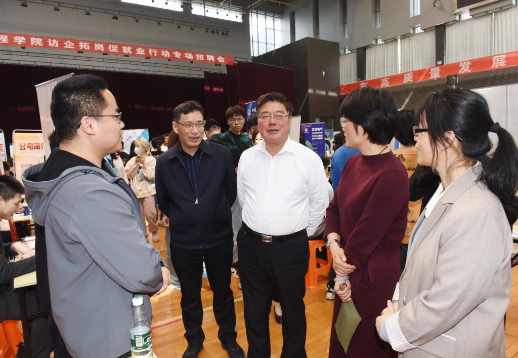 为深入贯彻党的二十大关于“实施就业优先战略”的决策部署,落实教育部进一步深入开展访企拓岗促就业行动要求,4月12日下午,太阳集团在天健苑·体育中心举办“访企拓岗促就业行动”专场招聘会,校党委书记史国君、党委常委、副院长张仰飞来到活动现场与用人单位、求职毕业生进行深入交流。学生工作处负责同志、二级学院(中心)党政负责人、分管学生工作负责人、专业教师代表参加活动。