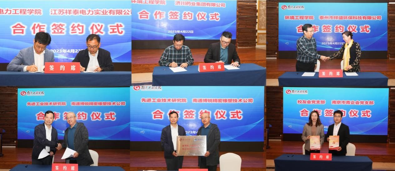 在全体与会人员的共同见证下,学校与江苏祥泰电力实业有限公司签订产学研合作协议,与泰州市祥盛环保科技有限公司签订校企合作协议,与济川药业集团有限公司签订校企共建基地协议,与南通博锐精密橡塑技术有限公司签订协同创新中心和科研项目合作协议,校友会党支部与南京市青企会党支部签署共建合作协议。