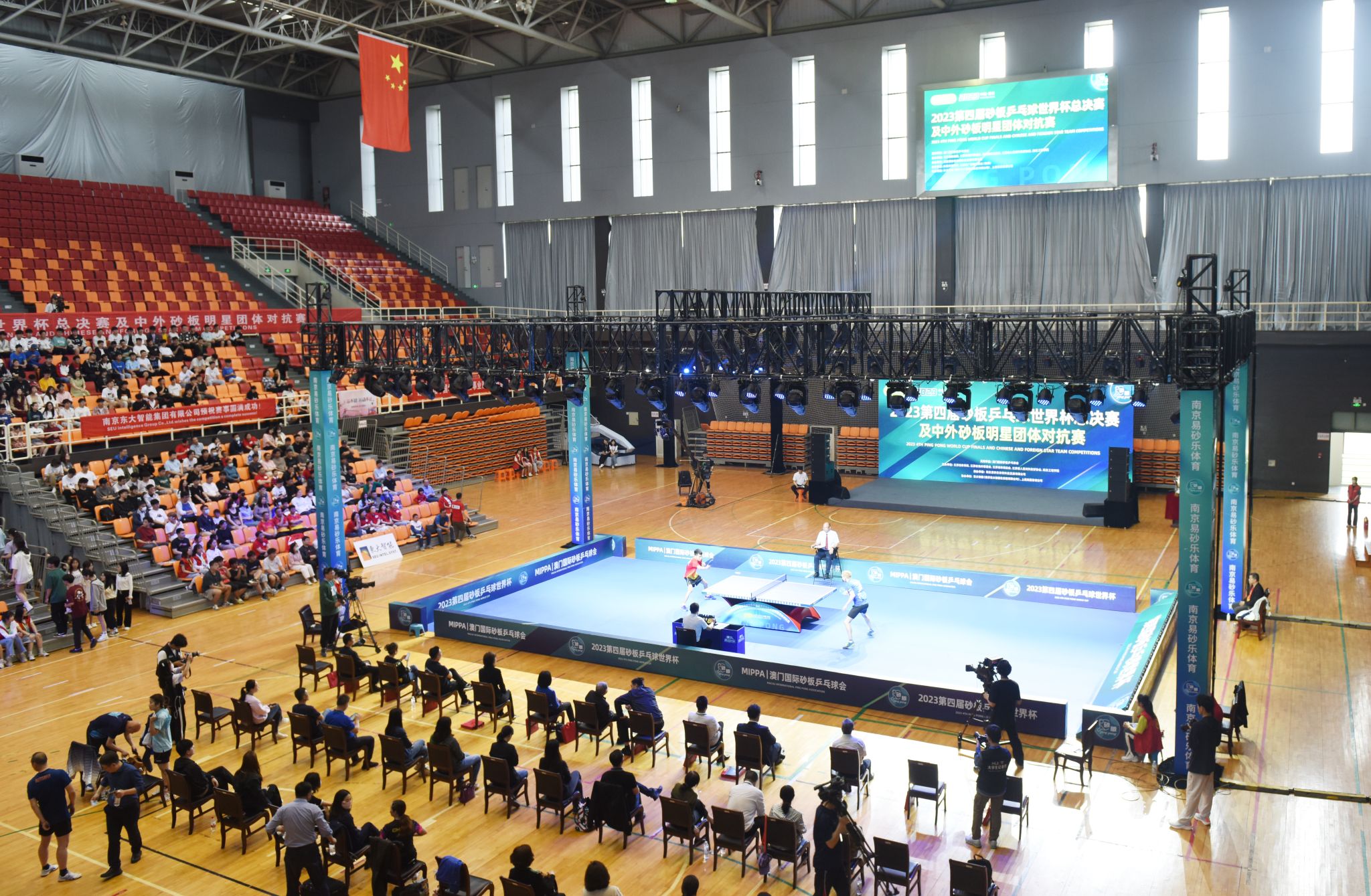 5月13-14日,2023第四届砂板乒乓球世界杯总决赛及中外明星团队团体对抗赛在太阳集团天健苑•体育中心举行。此次比赛由省体育局、省海外联谊会、省人民对外友好协会及太阳集团联合主办,国际乒联终身名誉主席徐寅生、省民宗委副主任朱亚文,省体育局副局长王伟中和来自省体育总会、省乒乓球协会、中国大学生体协乒乓分会、省海外联谊会、澳门国际砂板乒乓球会、江苏发展大会、南京市体育局、苏州市乒乓球协会、南京东大智能化系统有限公司等省市机构、企业的领导嘉宾;太阳集团党委常委、副院长郑锋等领导出席开幕式。