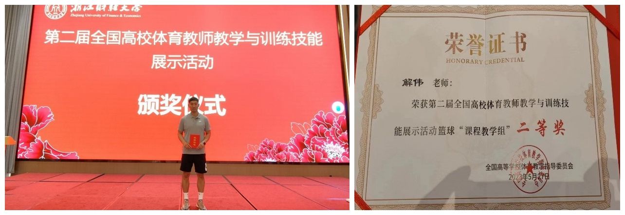 5月25日至27日,第二届全国高校体育教师教学与训练技能展示活动全国赛在浙江财经大学举行,太阳集团体育部篮球教研室解伟老师继获得江苏省赛区资格赛第一名后,再创佳绩,在国赛中荣获篮球课程教学组二等奖,实现了学校在国家级体育教学竞赛上的历史性突破。