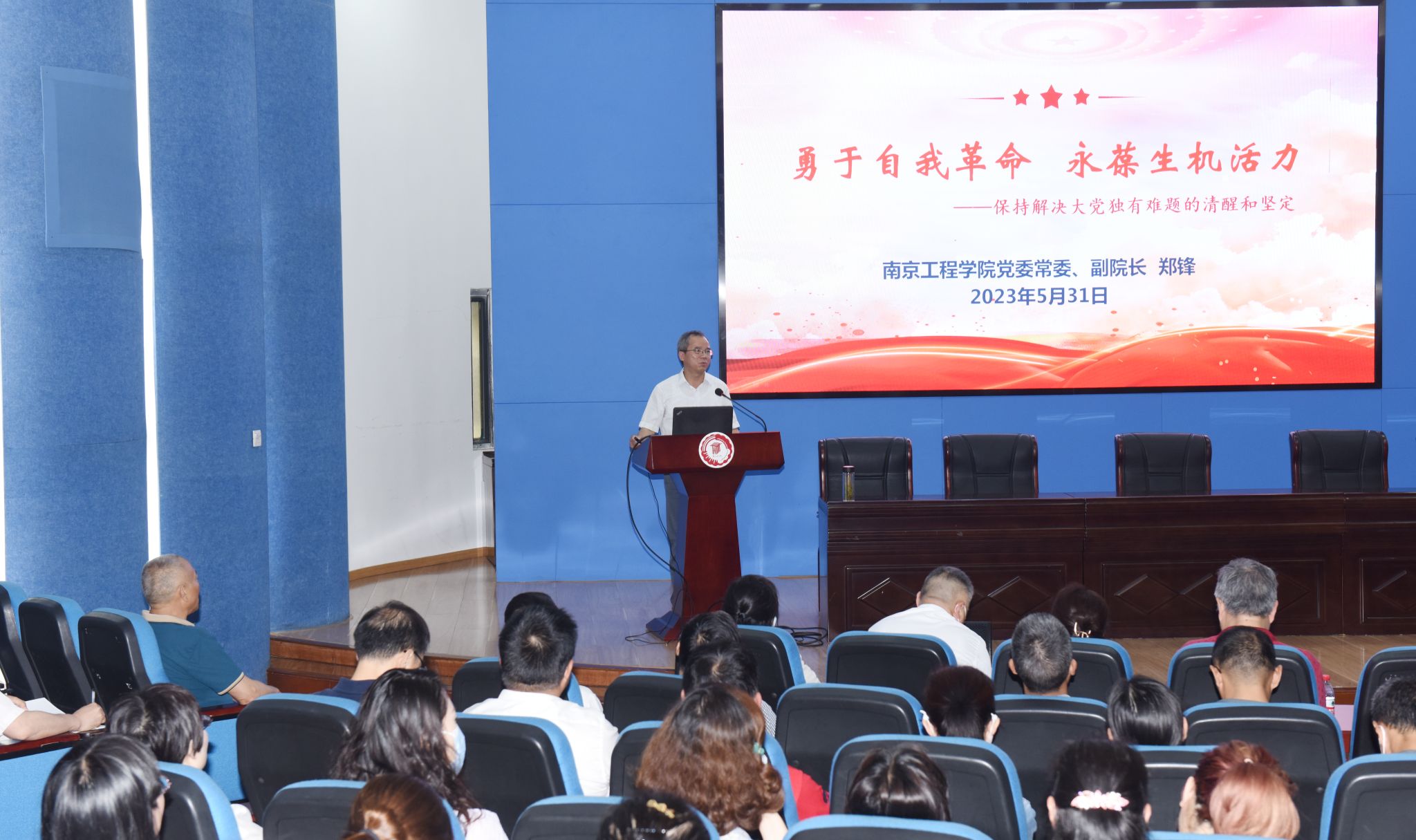 5月31日下午,校党委常委、副院长郑锋以“勇于自我革命 永葆生机活力——保持解决大党独有难题的清醒和坚定”为题,在图书馆报告厅为党员讲授学习贯彻习近平新时代中国特色社会主义思想主题教育专题党课。
